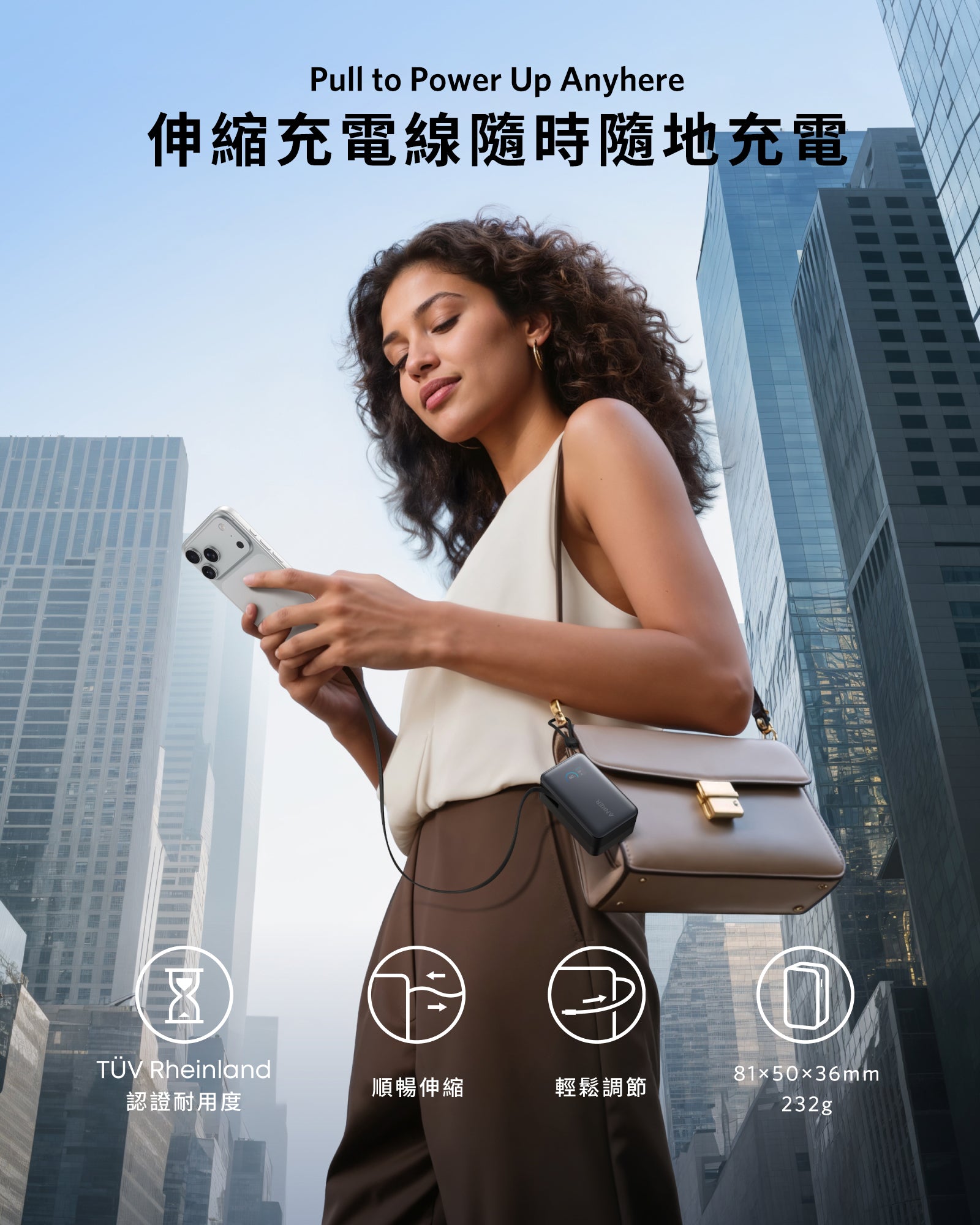 • 配備 1 條內建 USB-C 伸縮充電線 1 個 USB-C 及 1 個 USB-A