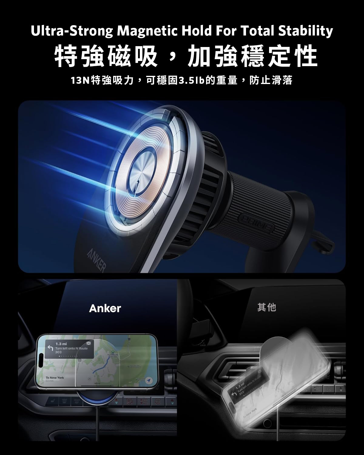 結合 13N 超強磁吸及出風口掛鉤支架,即使在崎嶇不平的路段也能牢固穩吸手機。